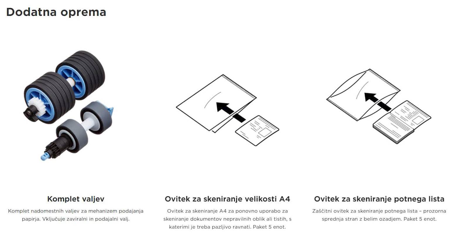 Specifikacije: https://www.canon.si/scanners/document-scanners/imageformula_scanfront_400/specifications/Namembnost: Poslovna uporabaTip čitalnika: Namizni pokončniTip čitalnika dodatno: A4 mrežni namizni skener s podajalnikom dokumentovTehnologija skeniranja: CIS - LEDHitrost skeniranja: več kot 40 str/minHitrost skeniranja dodatno: 45 strani/90 slik na minuto Maksimalna dimenzija skeniranja: A4Maksimalna dimenzija skeniranja dodatno: širina: 50,8 - 216 mm, dolžina: 54 - 356 mm (3048 mm v načinu dolgih dokumentov)Povezljivost: MrežaAvtomatsko obojestransko skeniranje: DaLočljivost: 600 dpiAvtomatski podajalec papirja: DaStandardna vhodna kapaciteta: 85 listovPredlagan dnevni cikel: do 6000 straniMere (Š x V x G): 305 (Š) x 282 (G) x 230 (V) mmTeža: 4,5 kgDodatne informacije: Približno 6000 skeniranj na dan, valjčki ERK SF400 (1550C001AA)Garancija v mesecih: 12 mesecev