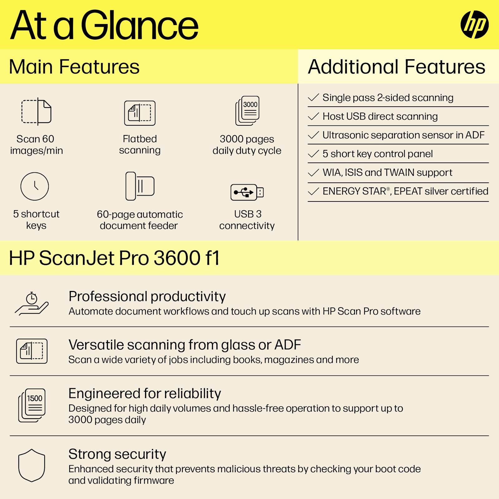 Povečajte produktivnost pri profesionalnih opravilih skeniranja s hitrim, kompaktnim in zanesljivim HP ScanJet Pro 3600f1, zasnovanim za skeniranje do 3.000 strani dnevno. Avtomatizirajte poteke dela z bližnjicami z enim klikom in hitrim obojestranskim skeniranjem iz 60-listnega samodejnega podajalnika dokumentov.