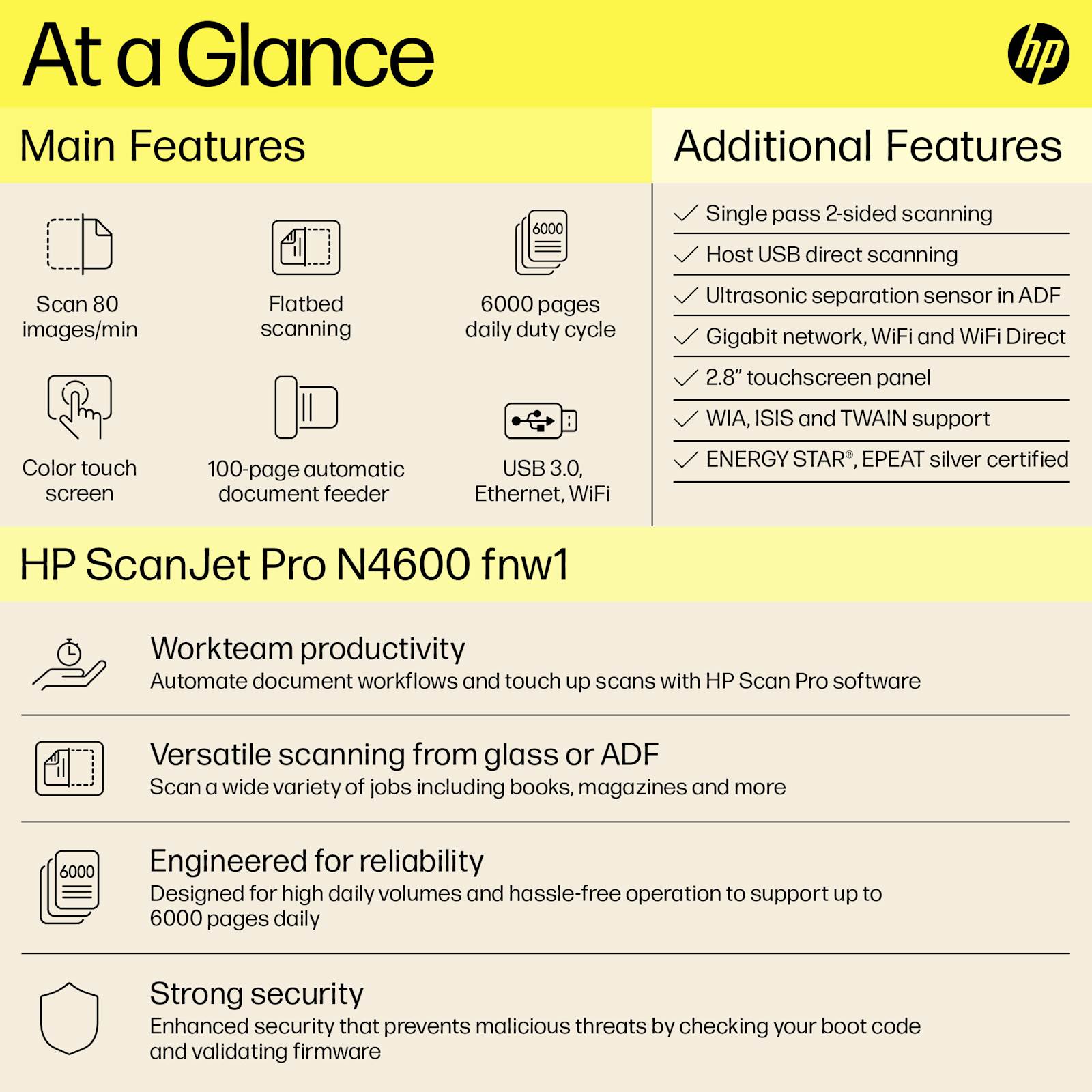 Povečajte produktivnost za profesionalna opravila skeniranja s hitrim, zanesljivim in omrežno povezanim HP ScanJet Pro N4600fnw1, zasnovanim za skeniranje do 6.000 strani dnevno. Avtomatizirajte poteke dela z bližnjicami in hitrim dvostranskim skeniranjem iz 100- listnega obojestranskega samodejnega podajalnika dokumentov.