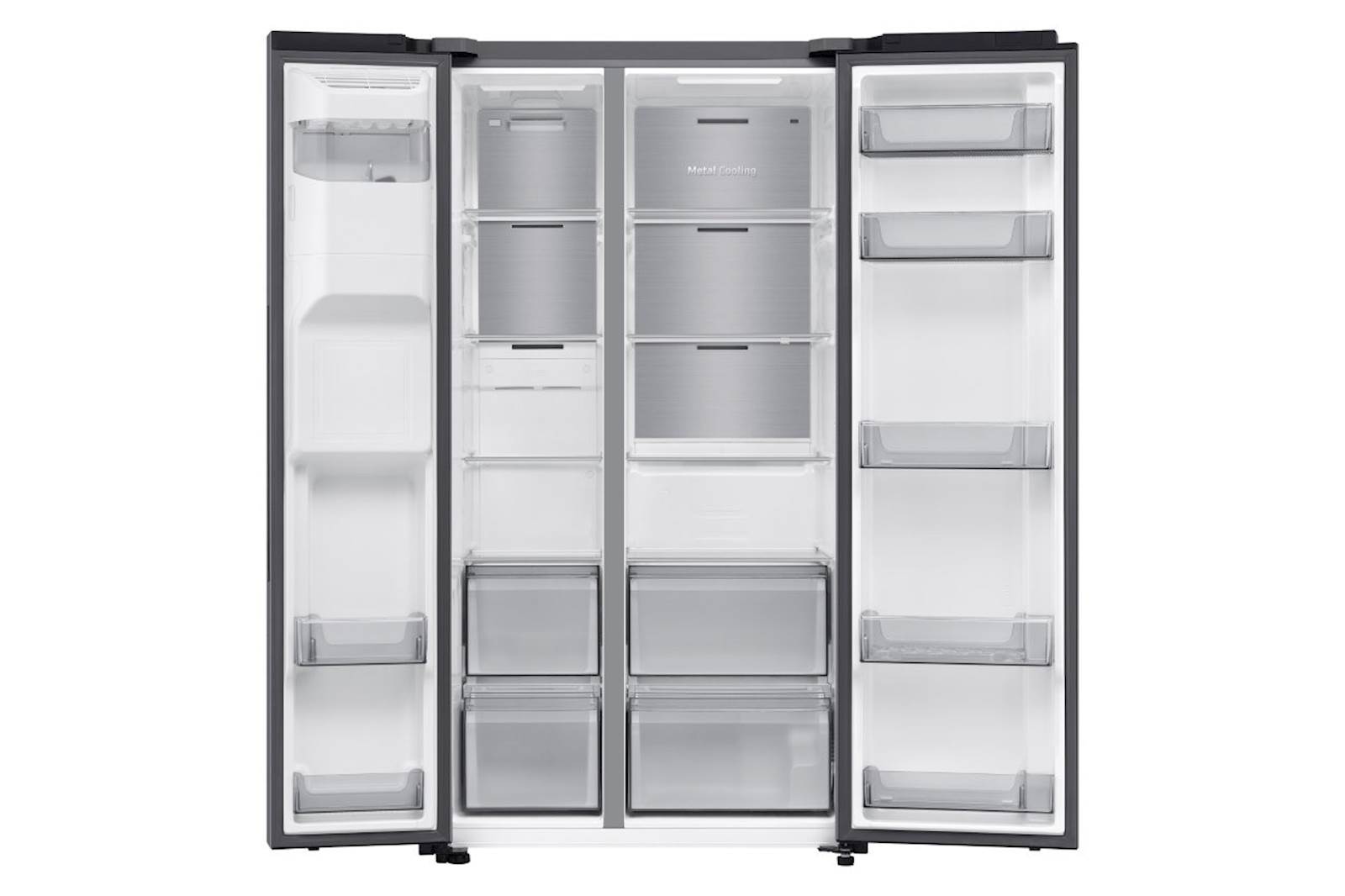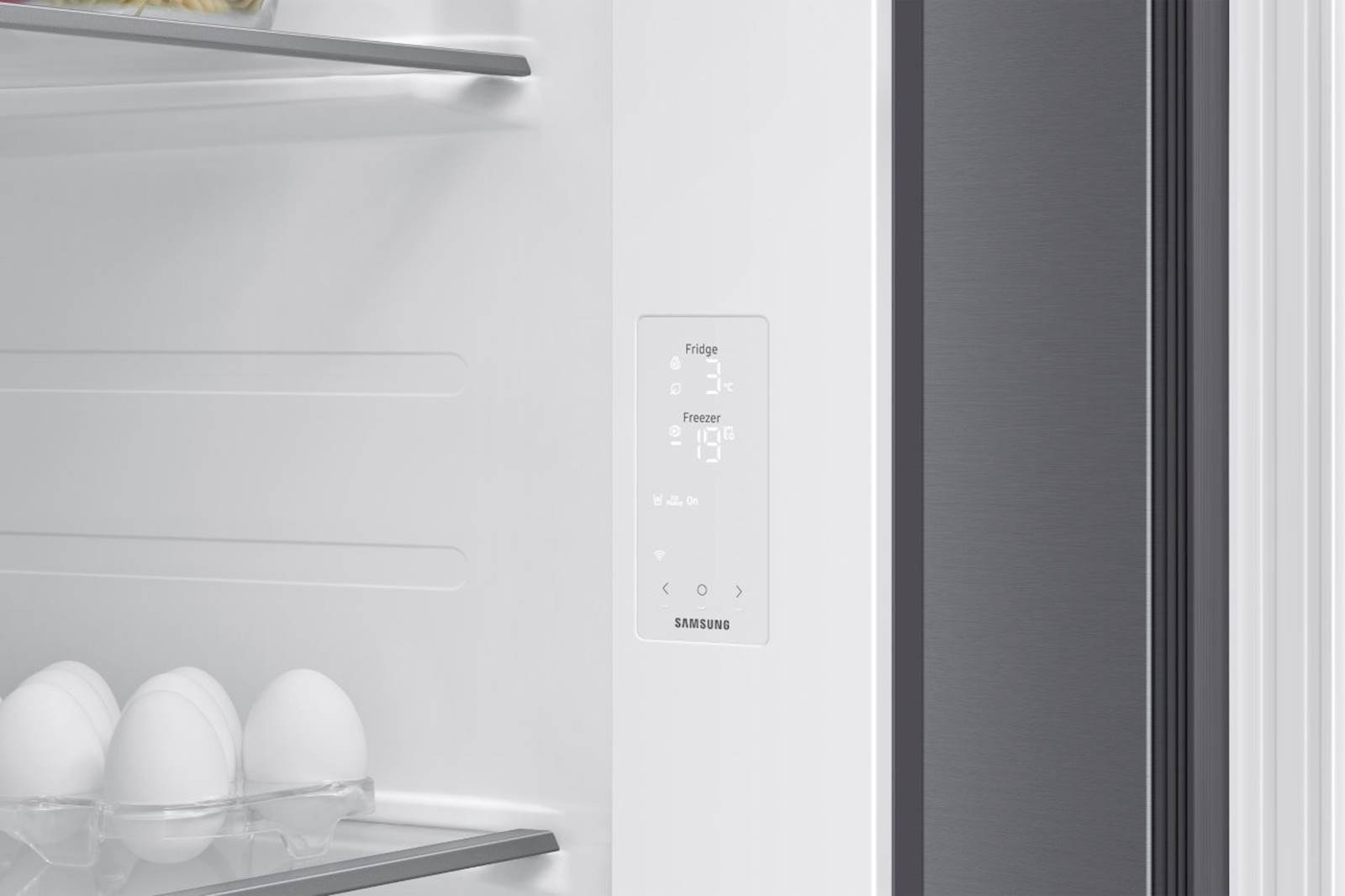 Nadzorujte in upravljajte svoj hladilnik kadarkoli in kjer koli. Vgrajeni Wi-Fi vam omogoča sledenje in prilagajanje njegovega delovanja z uporabo aplikacije SmartThings. Z lahkoto lahko nadzirate način hlajenja, spreminjate temperaturo in prejemate opozorila, če so vrata odprta. Zaradi SpaceMax™ tehnologije se stene hladilnika veliko tanjše. To vam omogoča, da v hladilnik shranite veliko količino živil. 13-kubični kompresor vzdržuje konstantno temperaturo in poskrbi, da je hrana dolgo časa sveža. Prav tako Twin Cooling prilagaja temperaturo in vlažnost v hladilniku in zamrzovalniku kar preprečuje mešanje vonjav in ohranja živila v idealnih razmerah. S pritiskom na gumb Power Freeze poskrbite za hiter dotok mrzlega zraka v zamrzovalnik, kar je priročno za hitro zamrzovanje živil in pripravo ledi.