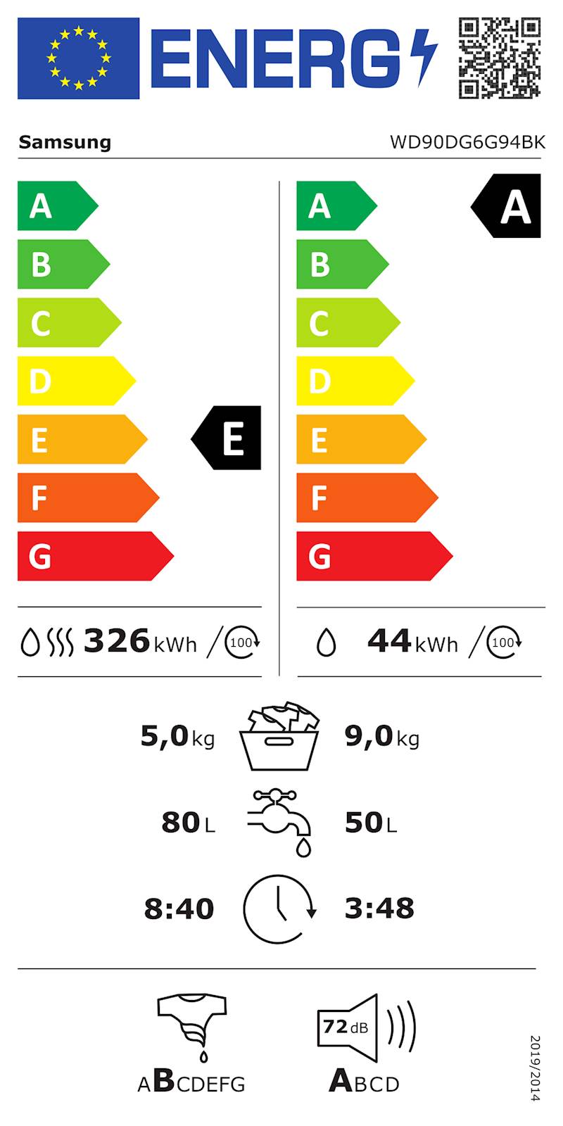 Specifikacije: https://www.samsung.com/si/washers-and-dryers/washer-dryer-combo/wd6100d-washer-dryer-combo-a-10-percent-extra-energy-efficiency-and-ai-ecobubble-9kg-white-wd90dg6g94bku4/Energijska nalepka: https://eprel.ec.europa.eu/labels/washerdriers2019/Label_2195172.pdfInformacijski list: https://eprel.ec.europa.eu/fiches/washerdriers2019/Fiche_2195172_SL.pdfZmogljivost pranja: 9 kgZmogljivost sušenja: 5 kgRazred energijske učinkovitosti pranja in sušenja: ERazred energijske učinkovitosti pranja: ANajvečja hitrost ožemanja: 1400Globina do 50 cm: NeInverter motor: Da - 20 letna garancija na motor z inverterjemPoraba energije na 100 ciklov pranja in sušenja: 326 kWhPoraba energije na 100 ciklov pranja: 44 kWhGlasnost med ožemanjem: 72 dBZamik vklopa: DaVarovalo za otroke: DaTehnologija pranja: Ecobubble™, Bubble Soak, samodejno doziranje - Auto DispenseUpravljanje na daljavo: vgrajen WiFi - Podpora za aplikacijo SmartThingsMere (Š x V x G): 600 x 850 x 480 mm, skupna globina z vrati 560 mmTeža: 65 kgDodatne informacije: pranje z umetno inteligenco, funkcija čiščenja bobna in predala, super speed pranje 39 min*, hitro pranje 15 min, Dodatne informacije dodatno: manj mikrovlakenGarancija v mesecih: 24