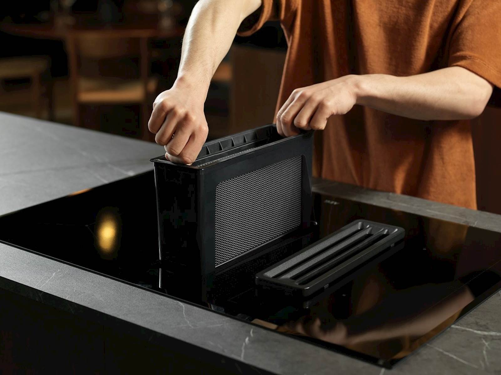 Funkcija Bridge združi dve kuhališči skupaj, tako da lahko uporabite kakršno koli veliko ali dolgo posodo. Povezani kuhališči, ki si delita isto temperaturno in časovno nastavitev, sta idealni, kadar kuhate za pogostitve ali večja praznovanja. 4 posamezni krmilni gumbi za kuhališča vam omogočajo nadzor nad 4 različnimi kuhališči in nastavitev ločenih časovnikov za vsako posebej. Druge funkcije vključujejo 9 stopenj moči, povečanje moči, aktivni dotik, varovalo za otroke in upravljanje hob2Hood. Filter 2 v 1 združuje ogljeni in maščobni filter, ki odstranjuje vonjave in maščobe. Če je naprava nameščena v načinu za kroženje zraka, je filter 2 v 1 nujen. Filter je mogoče enostavno odstraniti in ga očistiti v pomivalnem stroju. Samodejni način odsesavanja med kuhanjem. Če temperaturo na kuhalni plošči zvišate ali znižate, se temu prilagodi ventilator nape. Ko je kuhinjskih hlapov in pare preveč, pritisnite funkcijo povečanja moči (Boost) na napi za takojšnje zmogljivo odsesavanje. Povečanje moči (Boost) se aktivira za 10 min, da se učinkovito očisti zrak v kuhinji.