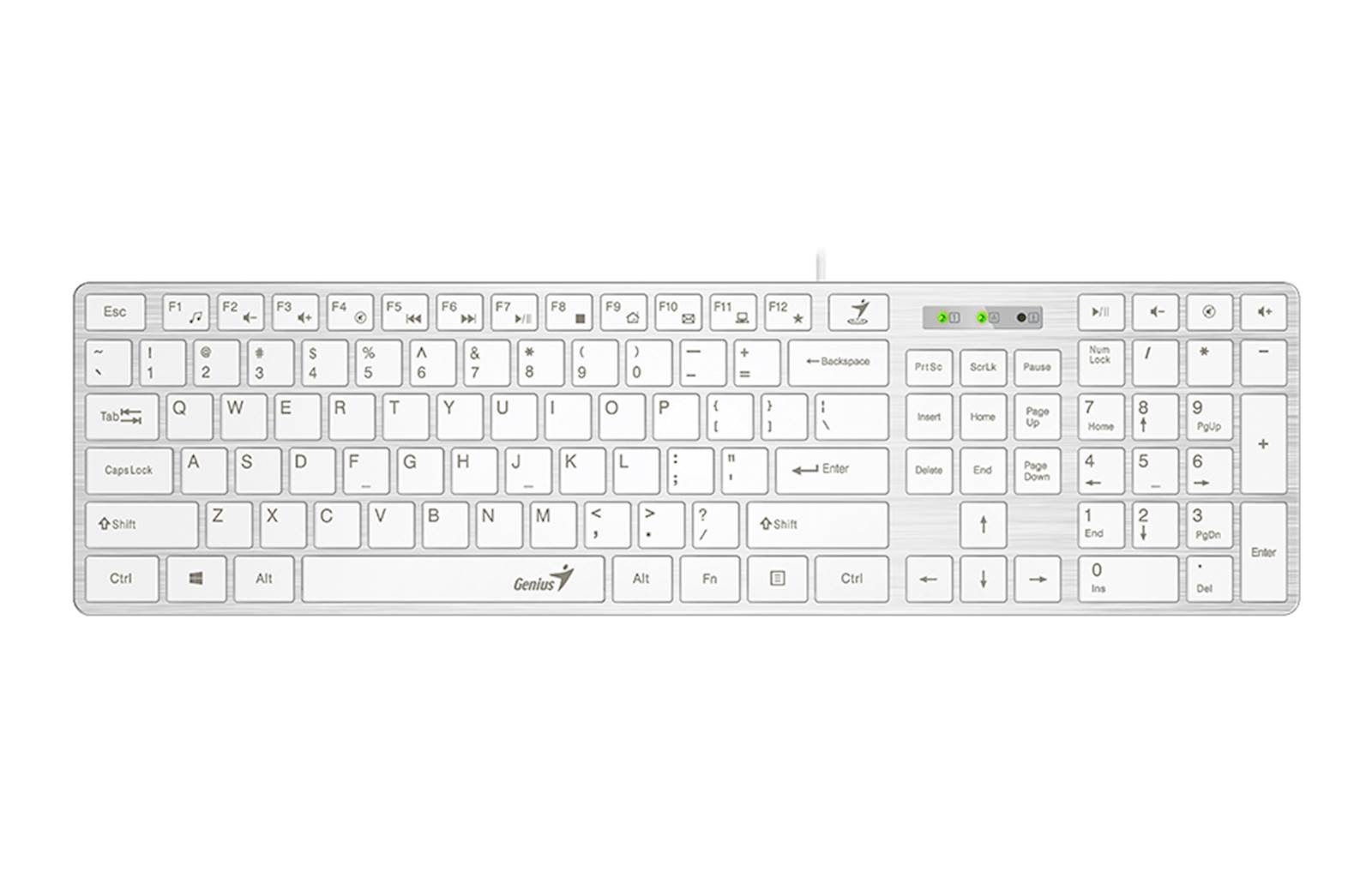Specifikacije: https://global.geniusnet.com/product/slimstar-126/Vrsta povezljivosti: žičnaKomplet z miško: NeGaming tipkovnica: NeSlovenski nabor znakov: DaBarva: belaDolžina kabla: 1,4 mBaterija (napajanje): neTeža: 416 gMere (Š x V x G): 431,40 x 117,41 x 22,40 mmDodatne informacije: 12 funkcijskih tipk, 4 multimedijske tipkeGarancija v mesecih: 12