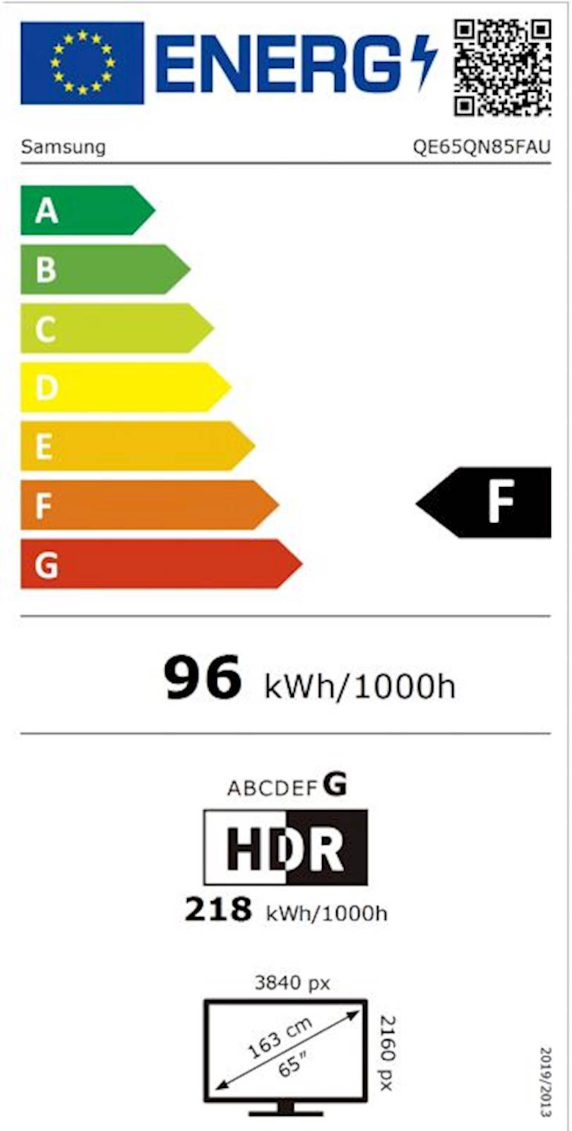 Energijska nalepka: https://images.samsung.com/is/content/samsung/p6/common/energylabel/common-energylabel-qe65qn85fauxxh-energylabel.pdfInformacijski list: https://images.samsung.com/is/content/samsung/p6/common/energylabel/common-energylabel-qe65qn85fauxxh-productfiche.pdfDiagonala zaslona: 165 cm (65'')Ločljivost zaslona: 3840 x 2160 4K UHDTip zaslona: Mini LED QLEDSmart TV: TizenOsveževanje zaslona: 100HzOsveževanje zaslona dodatno: (do 144Hz)HDR : DAHDR dodatno: Neo Quantum HDR, HDR 10+, Auto HDR RemasteringDodatne TV lastnosti: Supreme UHD Dimming, 4K AI Upscaling, Filmmaker Mode, EyeComfort ModeSistem zvočnikov: 40W, 2.2CHZvok: 360 Audio, Dolby Atmos, Q-Symphony, OTS Lite, Adaptive Sound ProProcesor: NQ4 AI Gen2 ProcessorPovezave: BT5.3, WiFi5, Ethernet (LAN)Priključki: 4x HDMI, 2x USB-A, CI SlotSprejemnik: DVB-T2CS2Daljinski upravljalnik: TM2360ETeža: 24.0 kg (s stojalom), 22.7 kg (brez stojala)Mere (Š x V x G): 1446.5 x 887.9 x 279.4 mmMere brez stojala: 1446.5 x 829.5 x 46.3 mmEnergetski razred: FBarva: ECLIPSE SILVERVESA standard: 400 x 300 mmGarancija v mesecih: 24m
