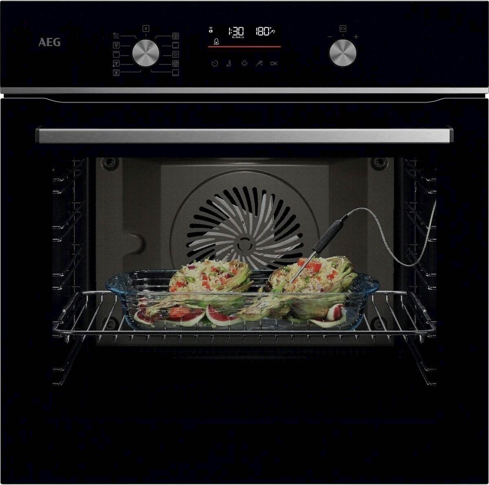 Specifikacije: https://www.aeg.si/kitchen/cooking/ovens/oven/oa5cb531ab/Energijska nalepka: https://eprel.ec.europa.eu/labels/ovens/Label_2227348.pdfInformacijski list: https://eprel.ec.europa.eu/fiches/ovens/Fiche_2227348_SL.pdfNamestitev: VgradniProstornina pečice: nad 70 lProstornina pečice dodatno: 71 LEnergetski razred: A+Barva: ČrnaNačin čiščenja: Katalitično čiščenjeZasteklitev vrat: TrojnaVentilator: DaOsnovne informacije: Vgrajen WiFi, možnost pečenja na 3 nivojih, sonda za meso, 1x pekač, 1x rešetka, dodatek za žar, ventilator za hlajenje, Osnovne informacije dodatno: samodejni ventilator: Med uporabo pečice se ventilator ustavi, ko odprete vrata.Mere (Š x V x G): 595 x 594 x 567 mmDodatne informacije: temperaturni razpon: 30°C - 300°C, vgrezni gumbi, samodejno predlaganje temperature, 9 funkcij, mehko zapiranje, Dodatne informacije dodatno: "Assist" s 45 vnaprej programiranih programovGarancija v mesecih: 24Teža: 32,5 kg