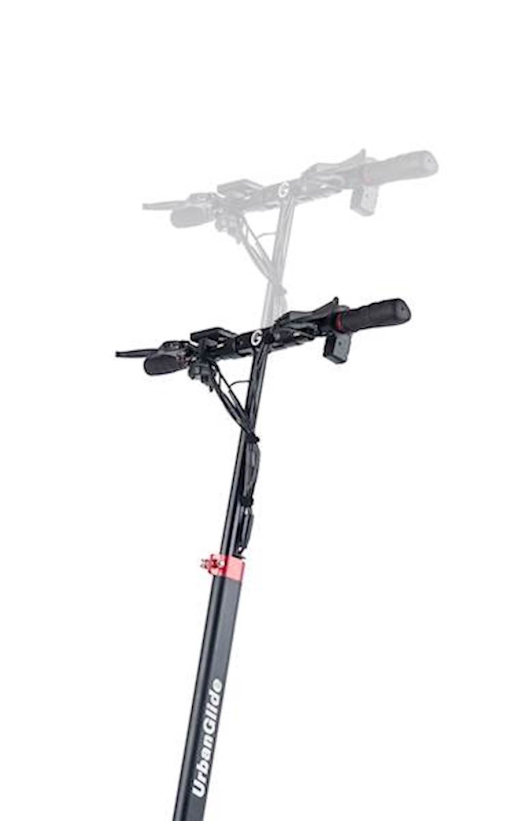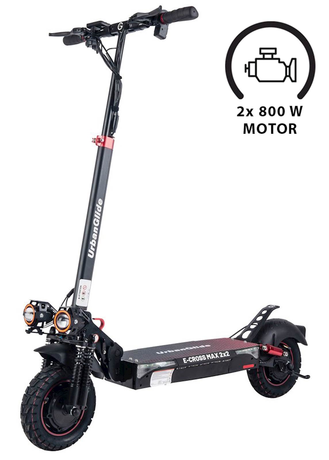 E-Cross Max je predstavnik najnovejše in najzmogljivejše serije električnih skirojev E-Cross blagovne znamke UrbanGlide. Predstavlja pravo kombinacijo dosega, udobja in moči. Njegova glavna lastnost je dvojni motor (pogon spredaj in zadaj). Z aktiviranjem dvojnega motorja lahko izkoristite do 2 x 800 W moči in uživate v neverjetnem pospeševanju ter navoru, z lahkoto pa se spopadete tudi z zahtevnejšim terenom. Vožnja je izjemno mehka in udobna. Skiro je opremljen s 17,5 Ah litijevo baterijo in ima doseg do 70 km (odvisno od terena in teže uporabnika). Opremljen je tudi z dvema disk zavorama spredaj in zadaj, dvojno sprednjo lučjo, svetlobnimi stranskimi trakovi ter zadnjo lučjo, zato ga lahko uporabljate tudi v urbanem okolju. E-Cross Max ima zelo široko stojno površino in je popolnoma vzmeten; sprednja vilica s 4 vzmetmi in zadnja vilica z 2 vzmetema. Poleg tega lahko enostavno prilagodite višino teleskopskega krmila (visok položaj: 130 cm; nizek položaj: 100 cm), zato je primeren tudi za višje uporabnike. Na zaslonu LCD lahko nadzorujete in prilagodite hitrost - na voljo so 3 stopnje hitrosti (od 6 km/h do 25 km/h). Na zaslonu lahko dostopate tudi do podatkov o potovanju: hitrosti, prevoženi razdalji, stanju baterije, itd. Kljub svoji impozantni velikosti (121 x 60,5 x 106 cm) je UrbanGlide opremil E-Cross Max z zložljivimi ročaji in teleskopskim krmilom, da bi optimiziral njegovo shranjevanje. Ko je zložen, ga je mogoče diskretno shraniti, saj so njegove dimenzije 121 x 24,5 x 43 cm. E-Cross Max je zmogljiv, robustni električni skiro atraktivnega videza, namenjen predvsem zahtevnejšim uporabnikom.