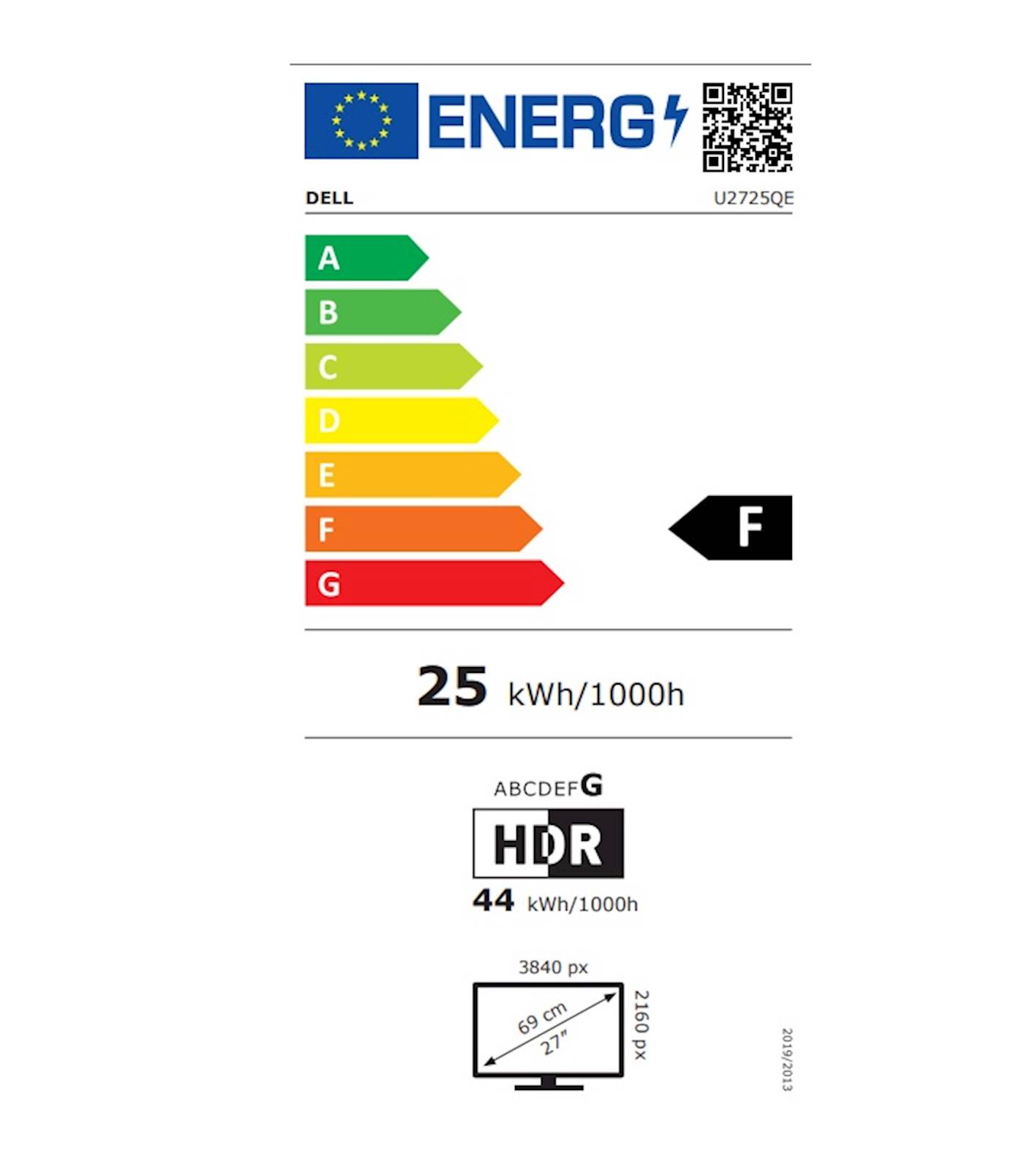 Specifikacije: https://dl.dell.com/content/manual9020664-dell-ultrasharp-27-4k-thunderbolt-hub-monitor-u2725qe-user-s-guide.pdf?languagInformacijski list: https://eprel.ec.europa.eu/screen/product/electronicdisplays/2166050Energijska nalepka: https://eprel.ec.europa.eu/labels/electronicdisplays/Label_2166050.pdfVelikost zaslona: 68,58 cm (27,0")Ločljivost: 3840 x 2160 ( 4K )Ločljivost dodatno: (16 : 9)Nastavljiv po višini: DaNastavljiv po višini dodatno: do 150 mmZaslon na dotik: NeZvočniki: NeUkrivljen zaslon: NePrilagodljivo osveževanje: BrezNamen monitorja: ProfesionalniPriključki: 1x HDMI, 1 x DP 1.4, 1x Thunderbolt™ 4 upstream port (DP 1.4, napajanje do 90 W), 1x RJ-45 (2.5GbE), 1x AudioPriključki dodatno: izhod, 1x Thunderbolt™ 4 downstream za daisy chain (video + podatki), 1x USB-C upstream, 5x USB-A downstream, 2xUSB-C Tip matrike: IPS Black, nebleščečSvetilnost: 450 cd/m2 / 600 cd/m2Kontrast: 3.000 : 1Odzivni čas: 5 msVelikost pike: 0.1554 mm x 0.1554 mmVidni kot: 178° vertikalno/ 178° horizontalnoHitrost osveževanja: 120 HzŠtevilo barv in barvni gamut: 1,07 milijarde, 100% sRGB, 100% Rec 709, 99% DCI-P3, 99% Display P3, Delta E < 1,5 Nastavljivost zaslona : višina do 150 mm, nagib -5° do +21° (tilt), vodoravni zasuk +/- 45° (swivel), obračanje za 90° (pivot)VESA standard: 100 x 100 mmBarva: srebrnaEnergijski razred: FMere (Š x V x G): 612.44 mm x 385.68 mm ~ 535.68 mm x 189.0 mmMere brez stojala: 612.44 mm x 353,51 mm x 55,6 mmTeža: 7,06 kg brez stojala, 5.22 kg s stojalomDodatne informacije: ENERGY STAR, EPEAT® Gold, RoHS Compliant, TCO Certified, BFR/PVC FreePriloženo: kabli 1x napajalni, 1x USB type - A - Type-C, 1x DP, 1x Thunderbolt pasivenGarancija v mesecih: 36