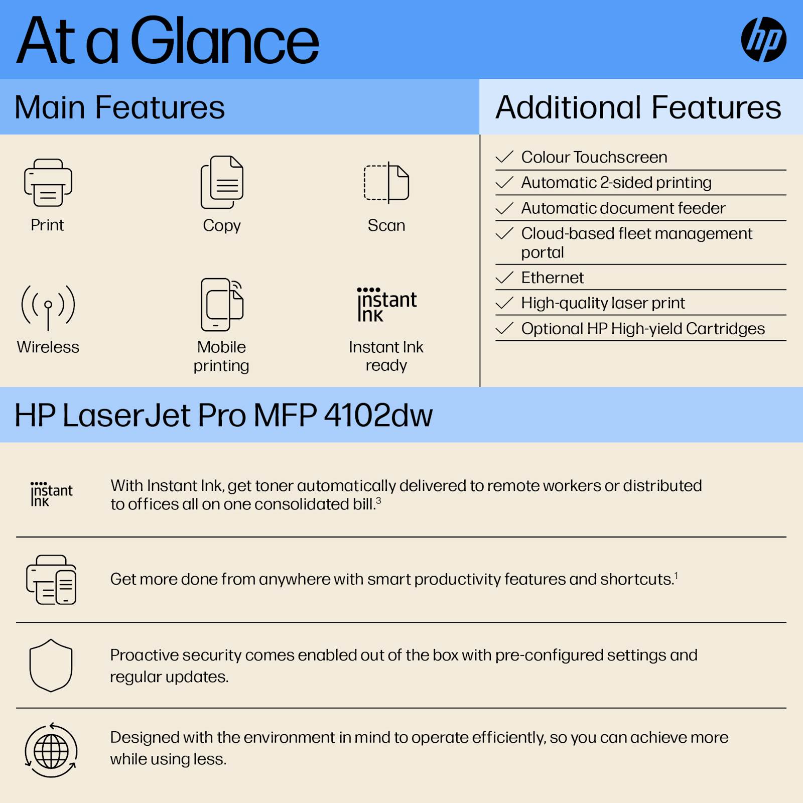 Tiskalnik HP LaserJet Pro 4102dw je zasnovan za zmogljivo produktivnost s hitrostjo tiskanja do 40str/min, ki omogoča preprosto vsakodnevno uporabo, tako da se lahko bolj osredotočite na svoje poslovanje. Omogoča učinkovitejše tiskanje, kopiranje in skeniranje. Prihranite čas, papir in stroške s samodejnim obojestranskim tiskanjem. Brezhibna povezljivost omogoča tiskanje od koder koli, iz katere koli naprave. HP Wolf Pro Security uporablja neprekinjeno zaščito in vam zagotavlja varnost vašega podjetja.